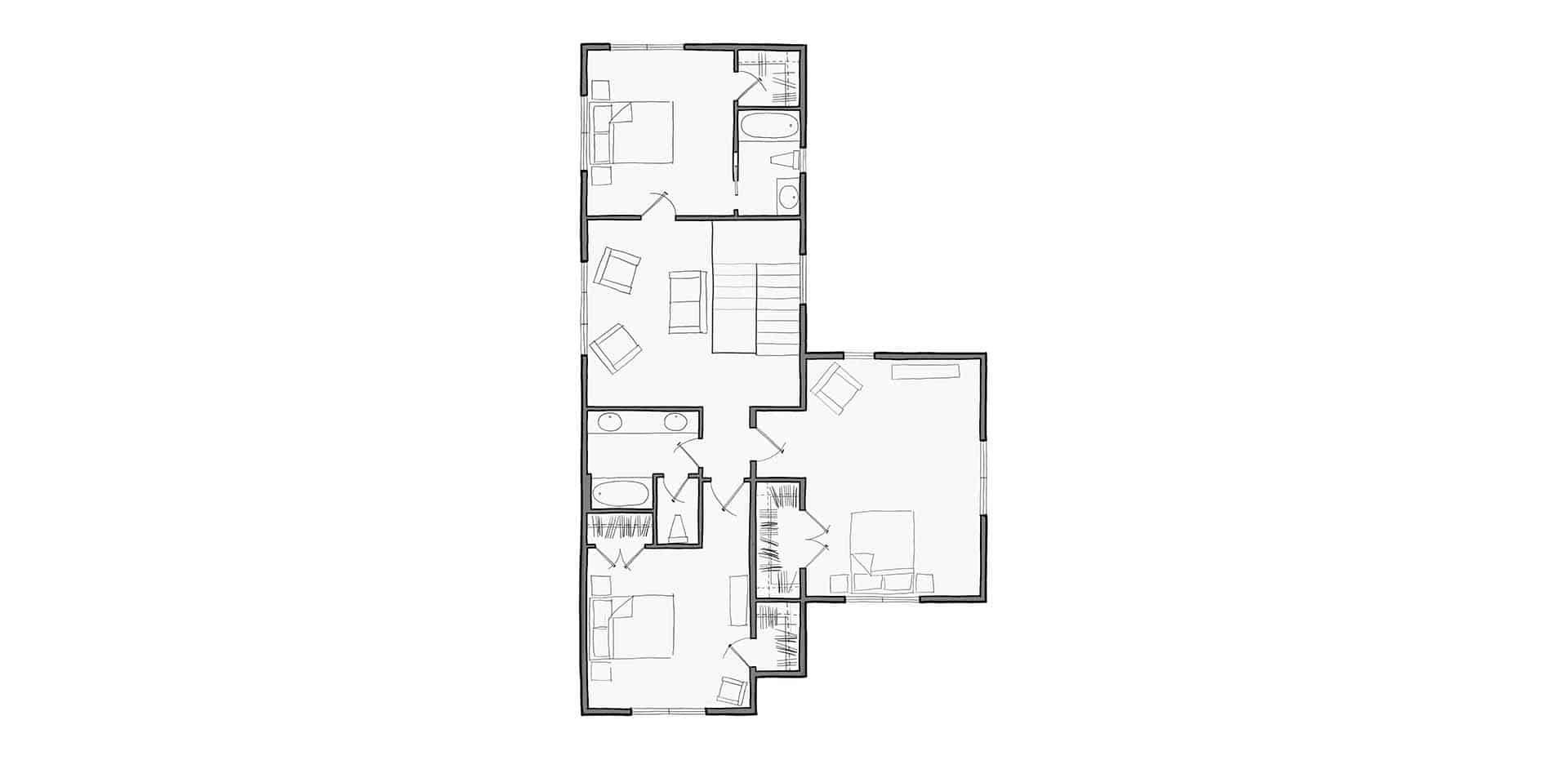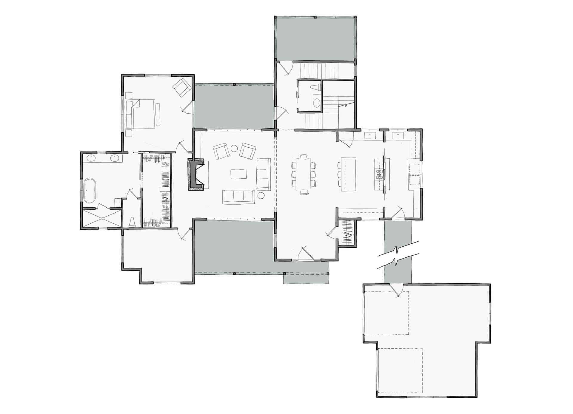 Big family and loads of friends – the Senepol will accommodate both. Four bedrooms, three and one half baths, study, play landing, three car garage/carport and a screened porch… This house packs in tons with its light footprint. The Kitchen is four in one with the butler’s pantry, wine bar, eat at island and office desk space. Great visual separation is given to the Master Suite with the storefront window, sunroom connection. See the fireplace stone chimney from all sides as it moves from interior to exterior spaces.